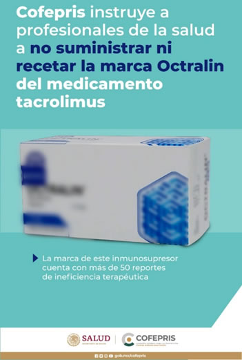Ante estos riesgos a la salud de pacientes trasplantados, esta autoridad sanitaria, en estricto apego a los artículos 397, 404 fracciones X, XII y XIII y 414 de la Ley General de Salud, ordena a profesionales de la salud a no continuar con el uso ni recetar más el Octralin en sus dos presentaciones de 1 y 5 miligramos, hasta en tanto esta autoridad sanitaria concluya la